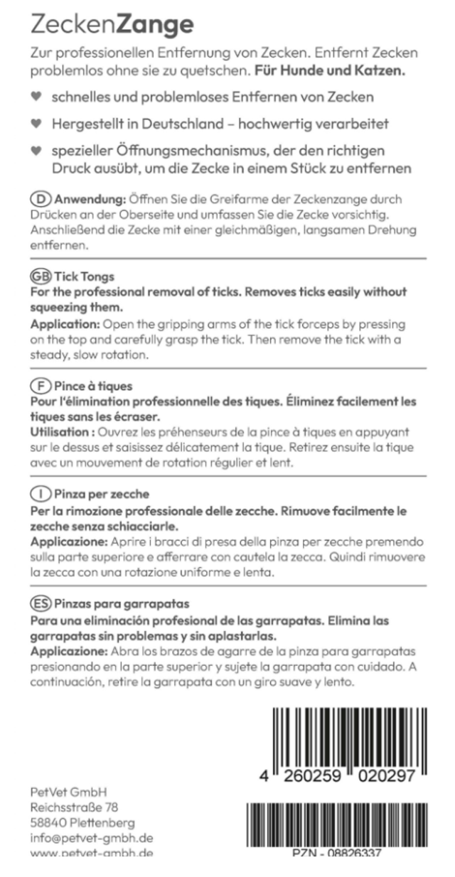 The PHA tick tweezers is an indispensable tool for Safe tick removal in dogs and cats . Thanks to the special opening mechanism, the optimal pressure is applied to remove the tick. in one piece without squeezing it – this significantly reduces the risk of infection.