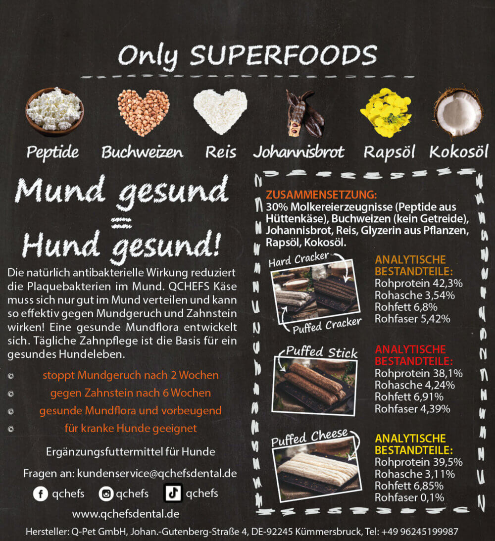 The QCHEFS happiness makers are the perfect mix of dental care and chewing fun: Three puffed cheese bones and a hard stick provide variety and effective tooth cleaning – even for gluttons! When chewed, they crumble in the mouth, distributing the active ingredient and working specifically against Tartar and bad breath .