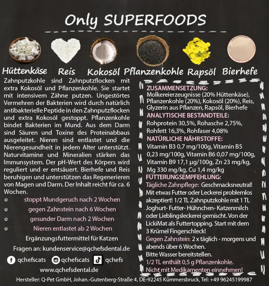 Ensure healthy teeth and a strong immune system for your cat – with the innovative QCHEFS Toothbrush Charcoal . This natural dental care combines ultrafine biochar , antibacterial peptides and Prebiotic ingredients to effectively combat bad breath, tartar and inflammation – without the stress of brushing your teeth.