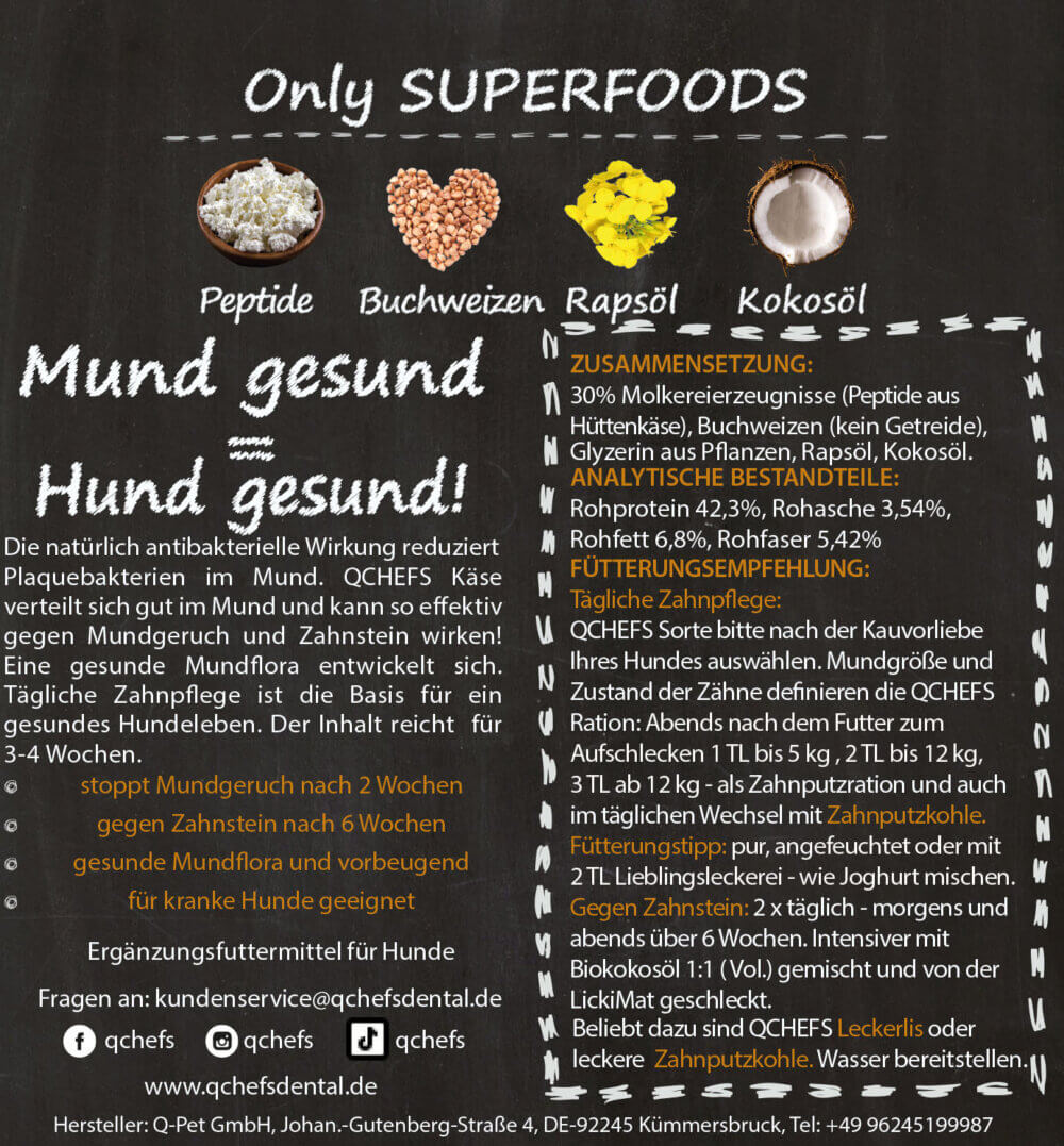 With the QCHEFS toothpaste flakes Dental care becomes your dog's favorite ritual. The natural flakes have an antibacterial effect, remove tartar, and freshen breath – all without brushing. Ideal for sensitive or sick dogs who can't tolerate anything else.