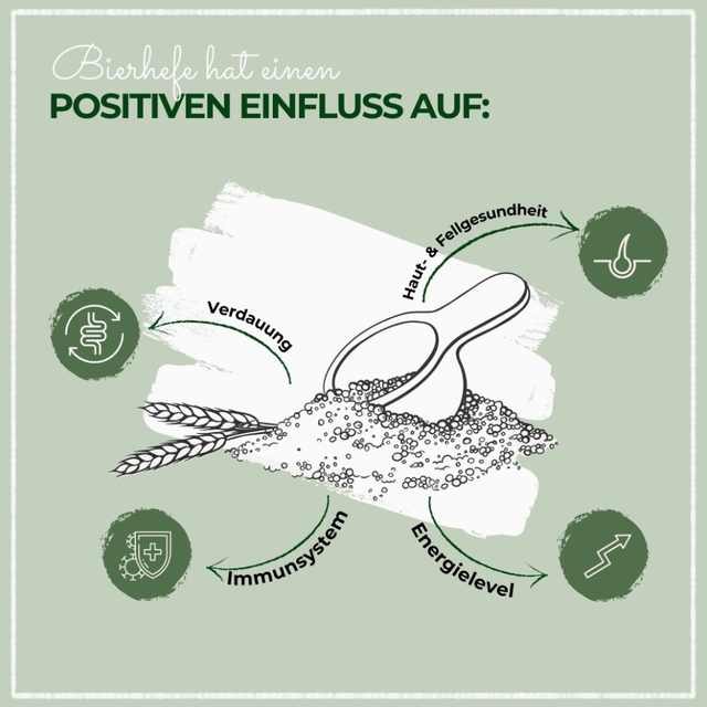 - Förderung von gesundem Fell und Haut: Bierhefe ist besonders bekannt für ihren hohen Gehalt an Biotin, einem B-Vitamin, das für gesundes Haar und gesunde Haut wichtig ist. Die Zugabe von Bierhefe zur Ernährung kann das Fell glänzender machen, Hautirritationen reduzieren und sogar helfen, Probleme wie übermäßigen Haarausfall zu mildern.